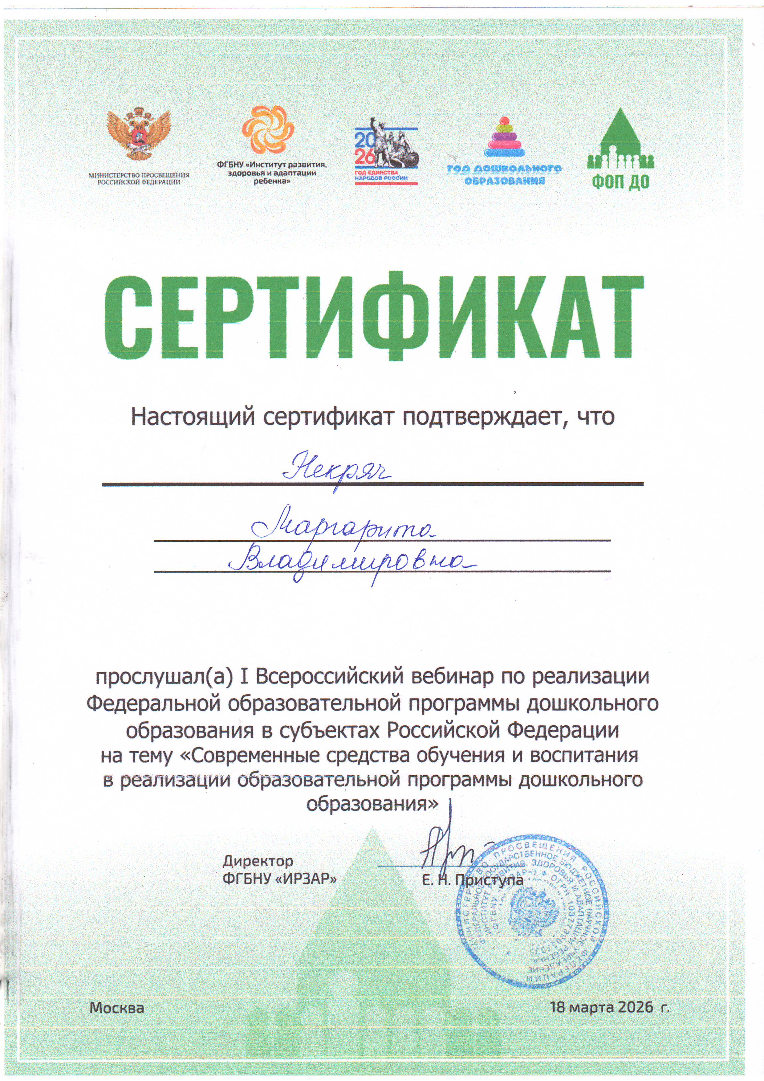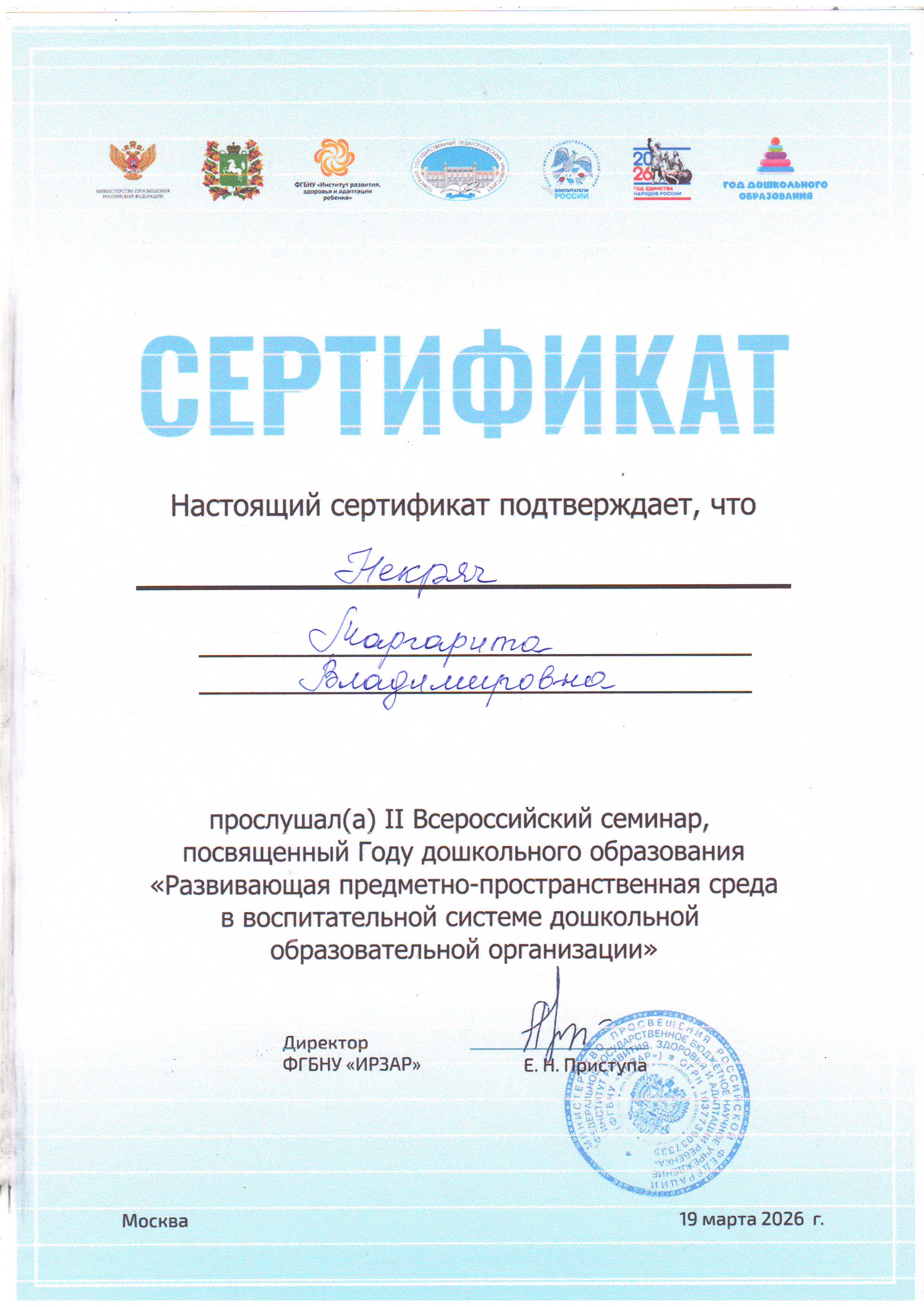 Сертификат II Всероссийский семинар, посвящённые Году дошкольного образования «Развивающая предметно-пространственная среда в воспитательной системе дошкольной образовательной организации» 19 марта 2026