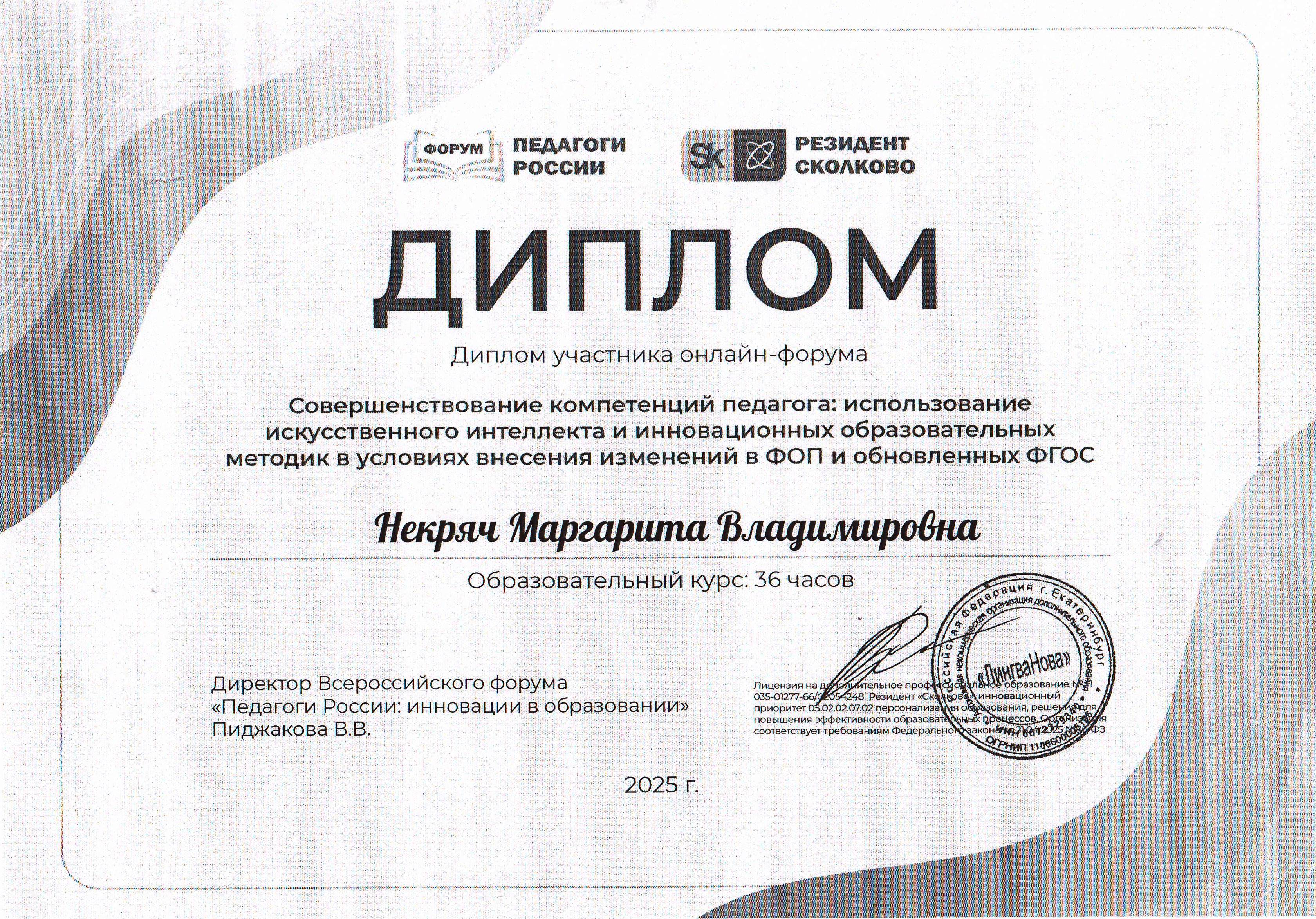 Диплом участника онлайн-форума "Совершенствование компетенций педагога: использование искусственного интеллекта и инновационных образовательных методик в условиях внесения изменений в ФОП и обновленных ФГОС", образовательный курс: 36 часов.