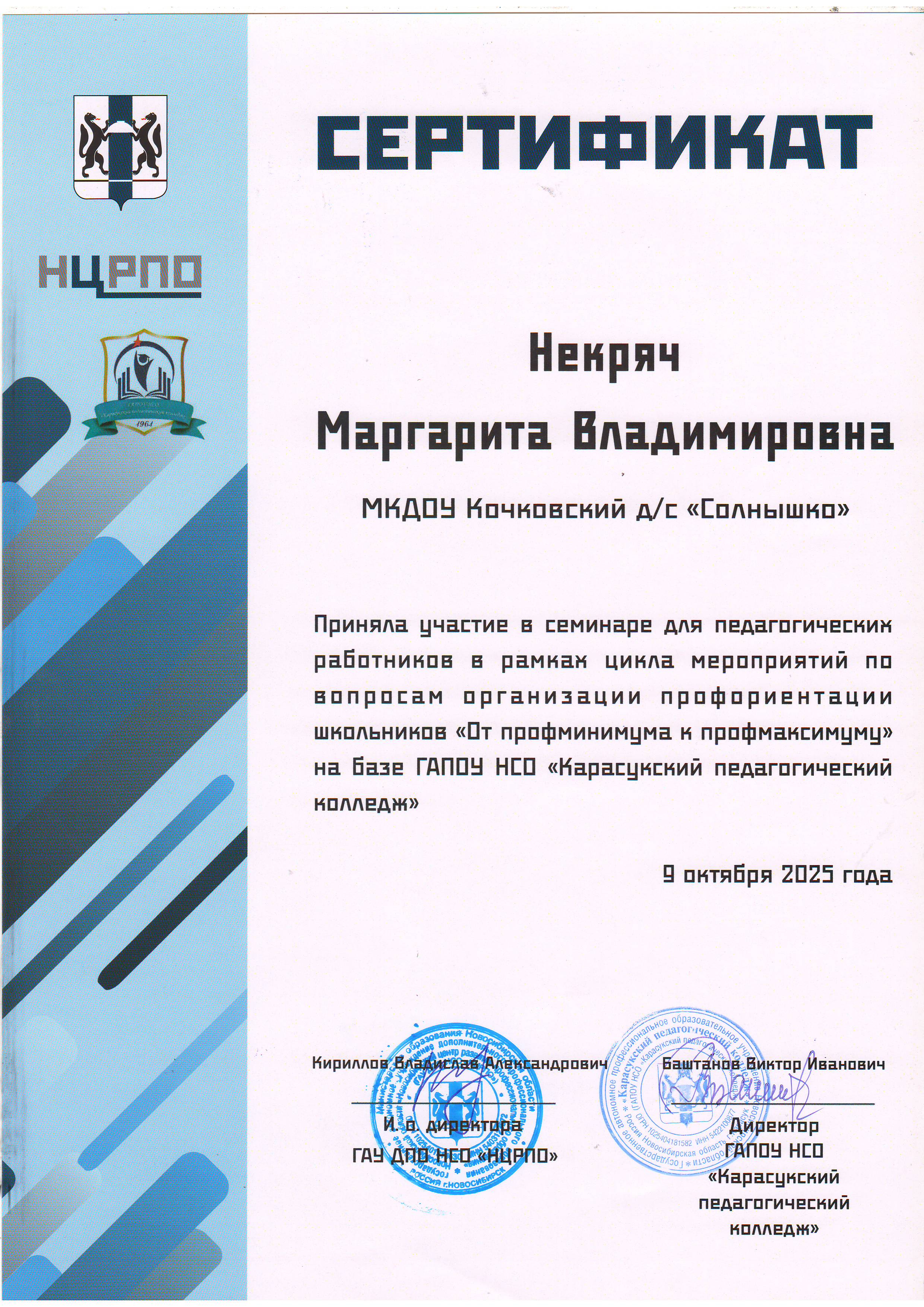 Сертификат участия в семинаре для педагогических работников в рамках цикла мероприятий по вопросам организации профориентации школьников "От профминимума к профмаксимому"на базе ГАПОУ НСО "Карасукский педагогический колледж" 9 октября 2025 год