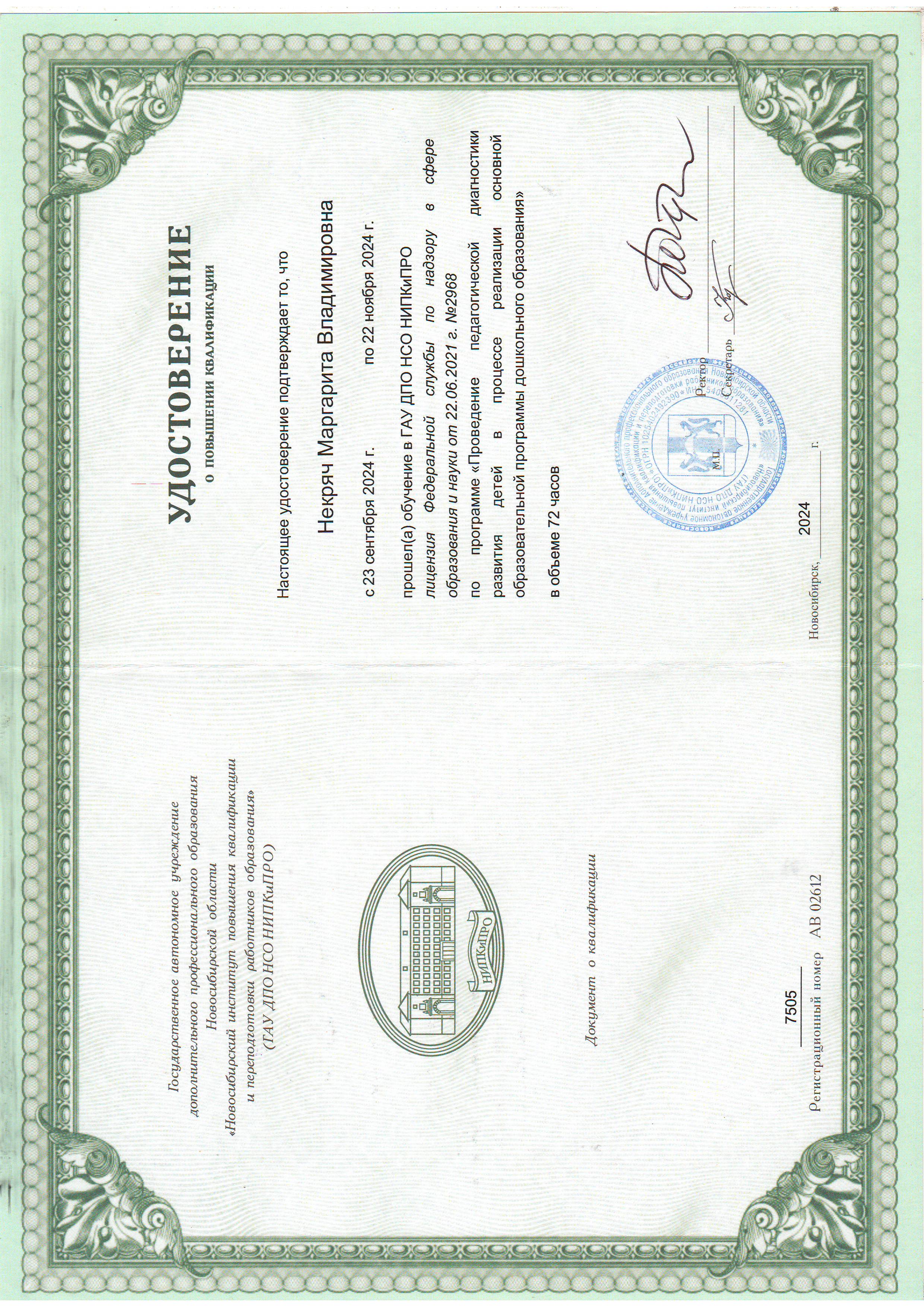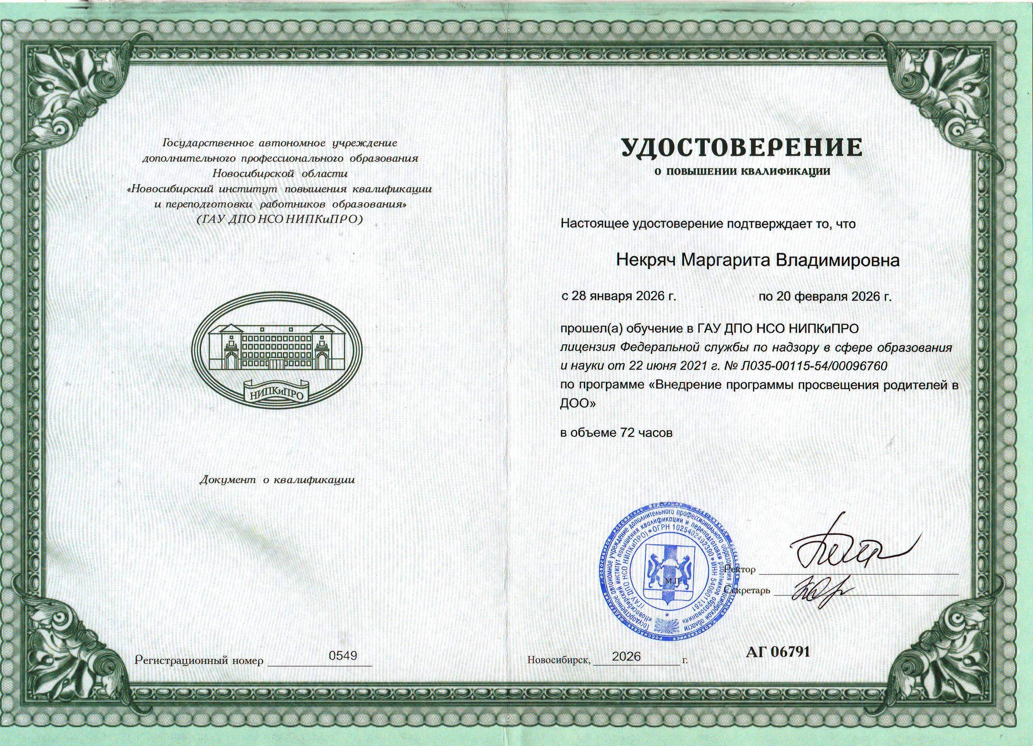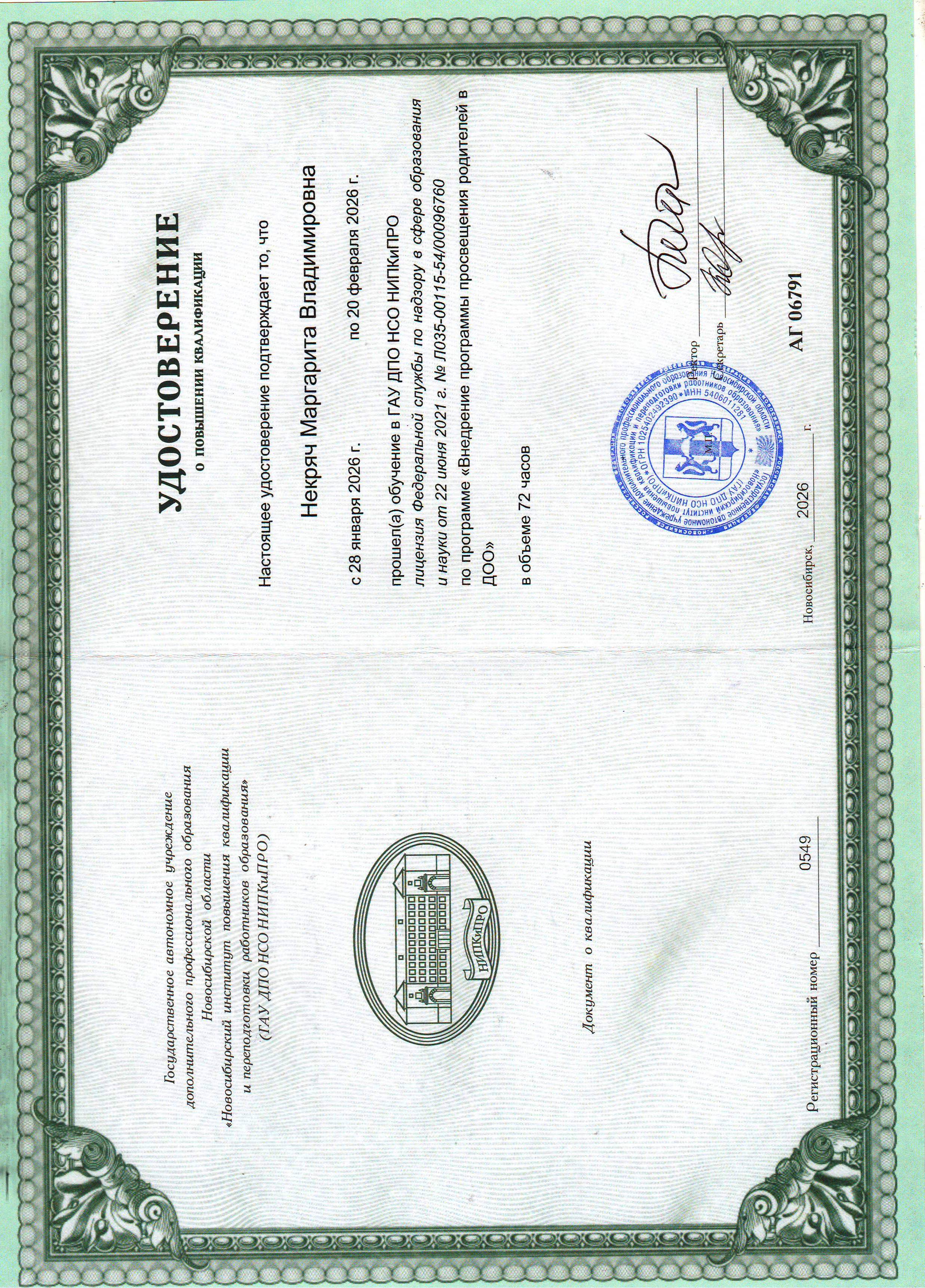 (ГАУ ДПО НСО НИПКиПРО г. Новосибирск. 72часов. Форма обучения: дистанционная. Направленность: иное).