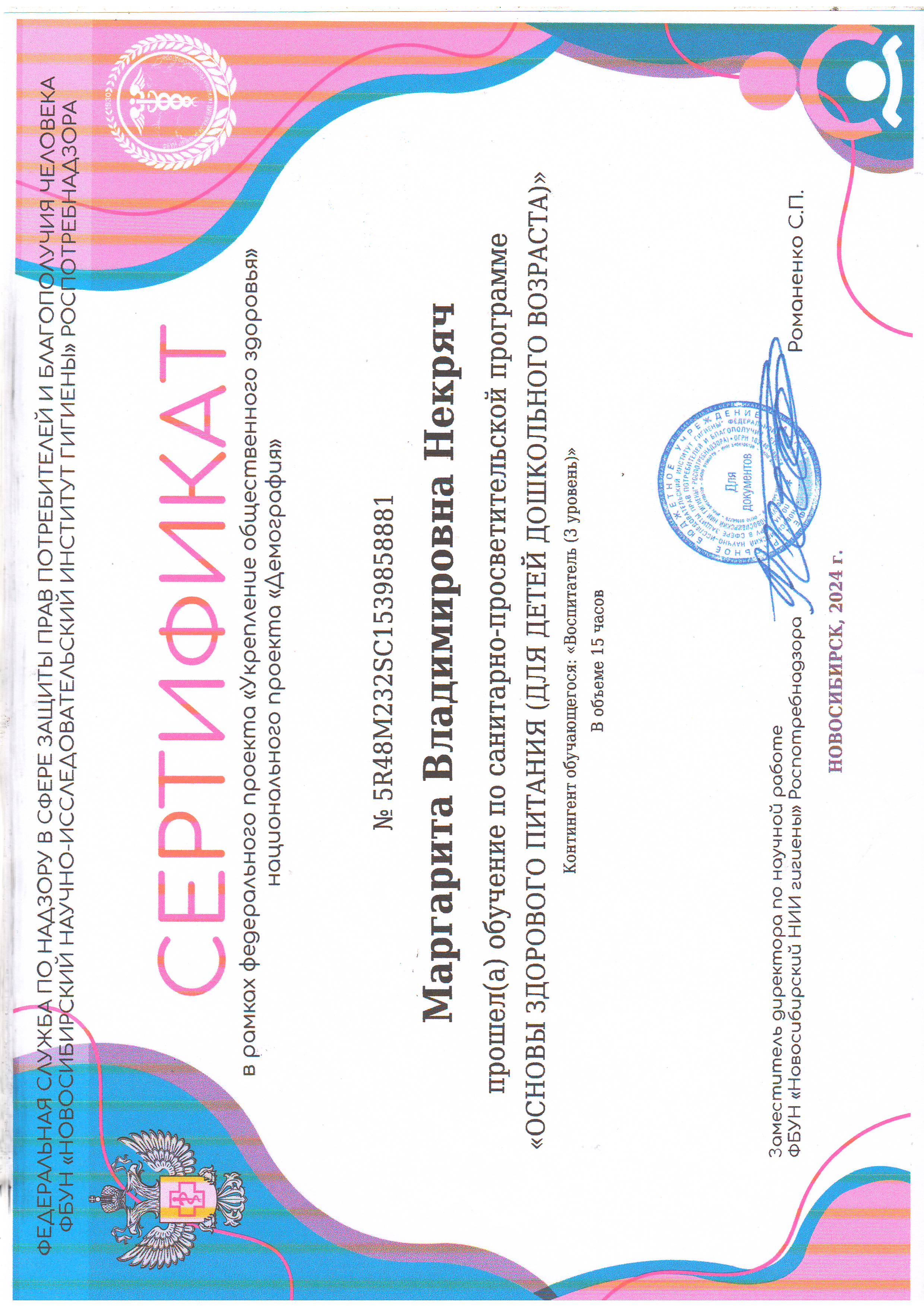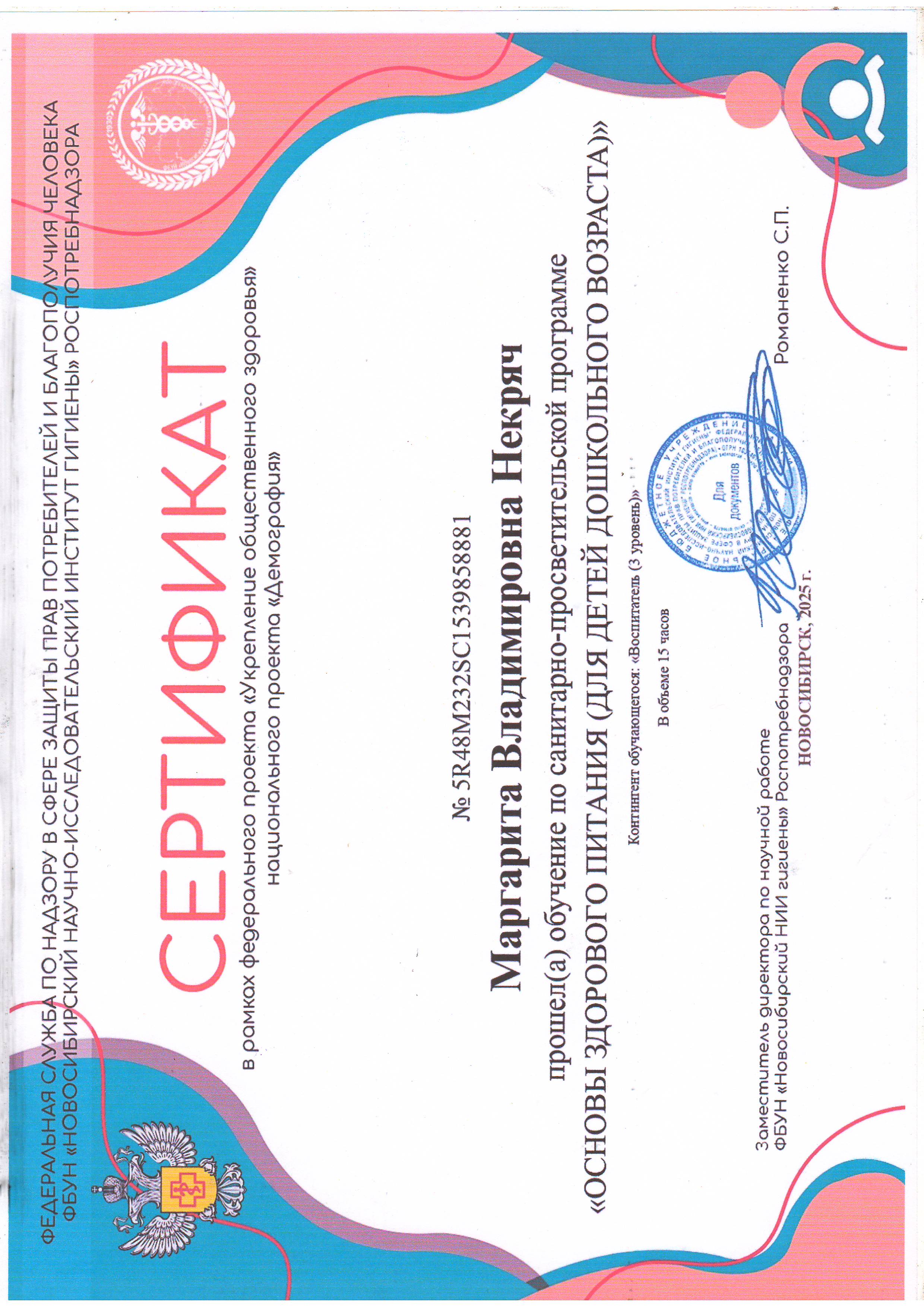 (Федеральная служба по надзору защиты прав потребителей и благополучия человека ФБУН "Новосибирский научно-исследовательский институт гигиены"роспотребнадзора. 15часов. Форма обучения: дистанционная.).