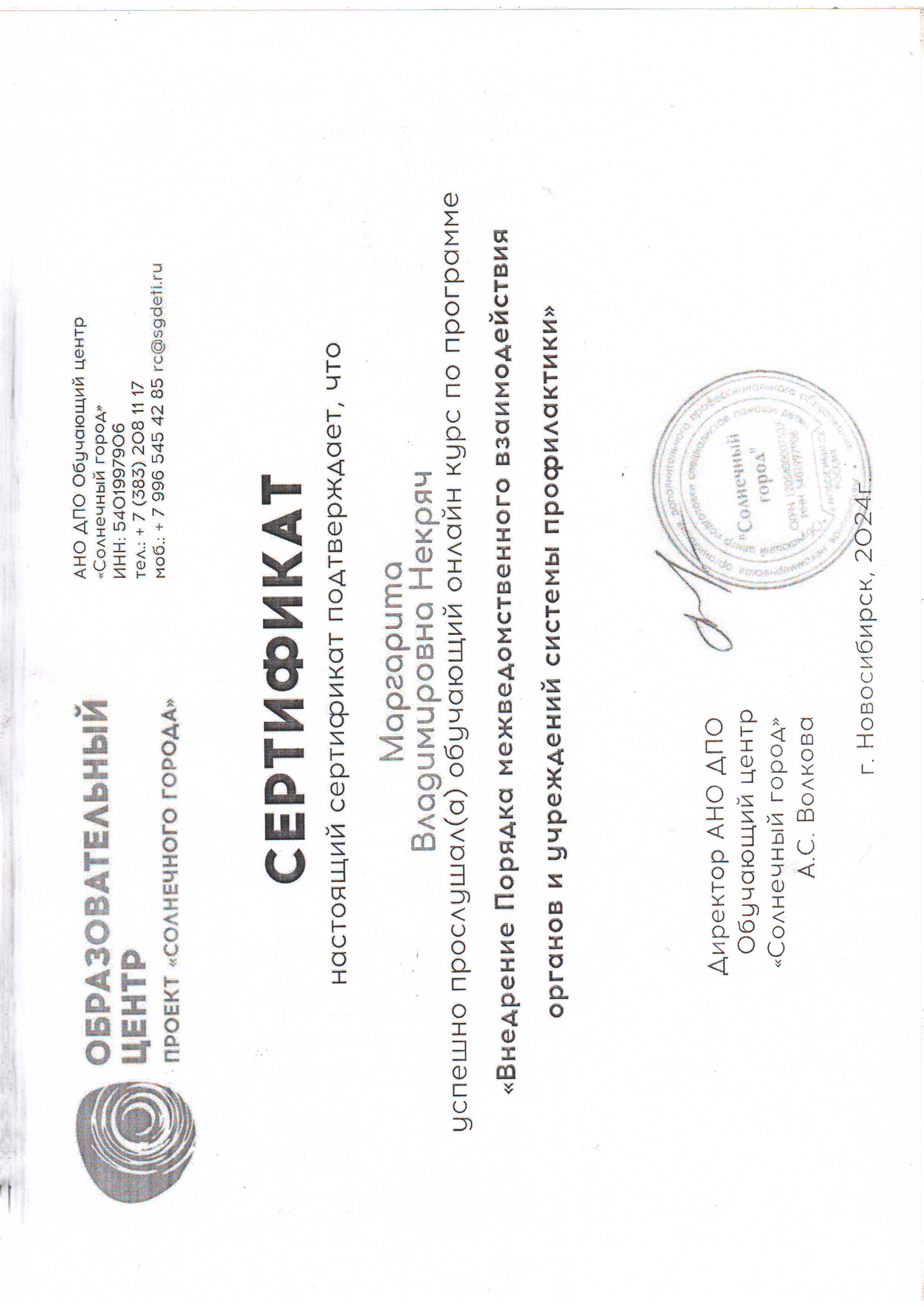 (АНО ДПО Обучающий центр "Солнечный город" г. Новосибирск. Форма обучения: дистанционная. Направленность: иное).